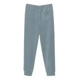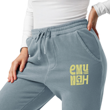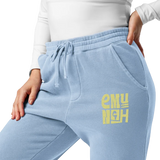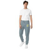 High-quality, unisex, pigment-dyed sweatpants with a yellow embroidered Emunah design. The garment dyeing process makes these sweats look washed out and ensures a unique Shtettl shade for each pair. These relaxed fit sweatpants have two pockets on the front and one on the back, and adjustable drawstrings for a secure fit around the waist.